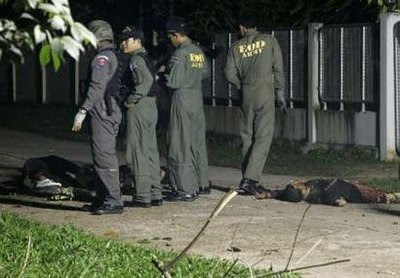Policemen inspect the bodies of military rangers after an attack by suspected Muslim militants in Thailand's Yala province, about 1,084 km (674 miles) south of Bangkok, September 13, 2009. Five military rangers were killed in Thailand on Sunday, police said, when an armed group attacked their base in Yala, a province in the far south that has seen an upsurge in separatist violence. REUTERS/Surapan Boonthanom